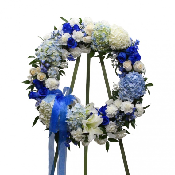 Blue and white hydrangeas, paired with luscious blue and white long-stemmed roses, lilies, carnations, and more form the basis of this classic sympathy wreath. Tribute arrives complete with free-standing wood easel.