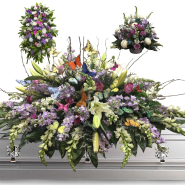 Butterflies remind us that even though we are apart from our loved ones, their spirit is always with us, forever in our hearts. Let this set of original Cattleya European Floral creations help express this sentiment and your deepest condolences. Hovering butterflies, gently nestled between the snapdragons, stock, lilies, and other beautiful florals and branches. The perfect collection of tributes for your loved one.