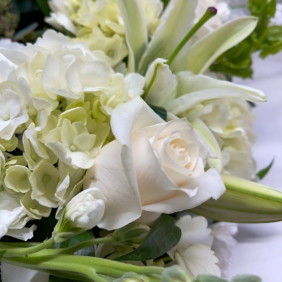 Celebrate the life and legacy of a loved one with our elegantly crafted urn arrangement. This exquisite display, carefully designed to convey grace and beauty, features a serene blend of white hydrangeas, fragrant lilies, classic roses, and delicate daisies. Each bloom is thoughtfully nestled among complementary foliage, creating a perfect setting to showcase an urn or cherished photograph during a funeral or memorial service. With its heartfelt elegance, this arrangement serves as a touching tribute, honoring memories with warmth and dignity.