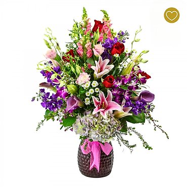 This genuinely graceful and elegant arrangement combines the finest available luxury florals to include pink lilies, fluffy soft hydrangeas, stunning calla lilies, snapdragons, and more. The beauty of this arrangement has made it undoubtedly a favorite amongst our customers.