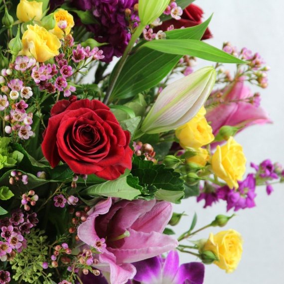 This luxurious arrangement is sure to make an unarguable statement about the depth of your love. A Ruby Red Dimple Vase is brimming with incredible lush Stargazer Lilies, White Calla Lilies, Classic Red Roses, yellow spray roses, and assorted greenery. This beautiful bouquet is finished with vibrant mini green hydrangeas and purple statice.