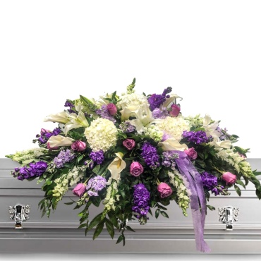 Full and vibrant this beautiful casket spray holds delicate blooms of fragrant stock, open-cut calla lilies, hydrangeas, lavender roses, and more making a beautiful tribute for the memorial, funeral, or graveside service.