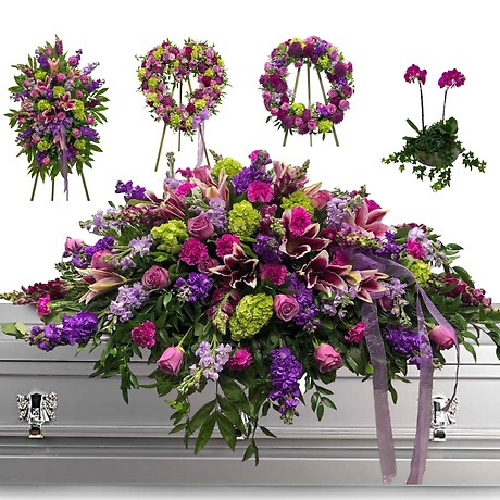 Full and vibrant, traditional yet striking, this bountiful collection of purple and white classic sympathy arrangements of delicate blooms of fragrant stock, open-cut calla lilies, hydrangeas, white lilies, stock, lavender roses, and more make a beautiful backdrop of tributes for the memorial, funeral, or graveside service.