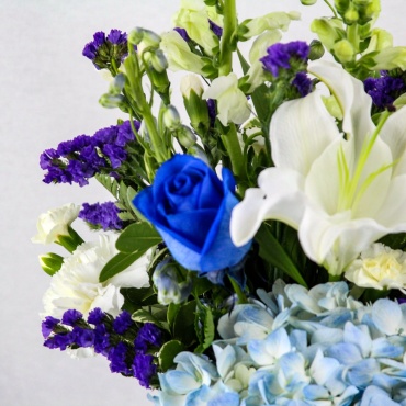 Thoughtful Elegance is a beautiful blue and white arrangement with lush hydrangea, fragrant lilies, gorgeous roses, vibrant statice, delphinium, mini carnations, and leather leaf fern in a blue container. The perfect arrangement for those blue lovers!